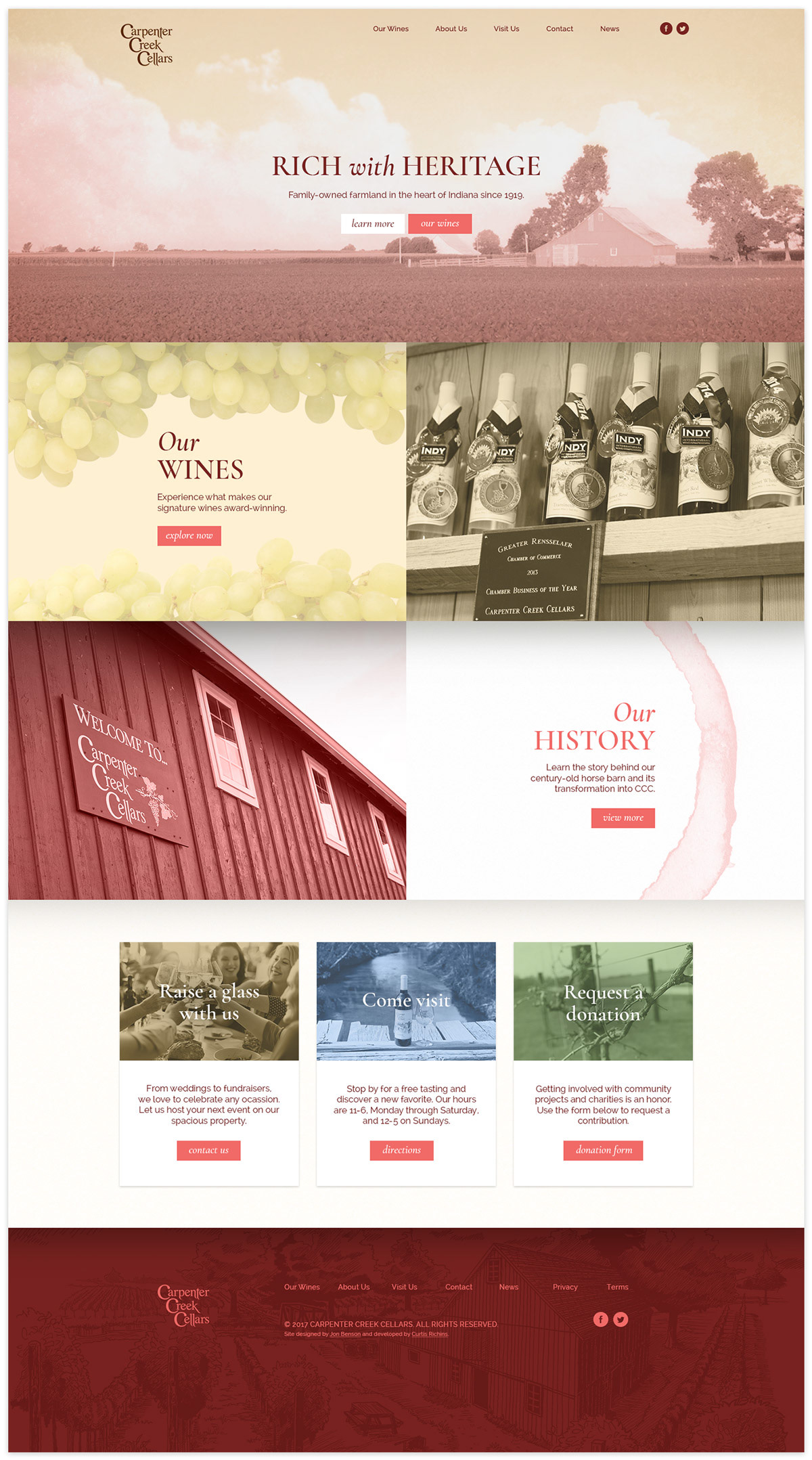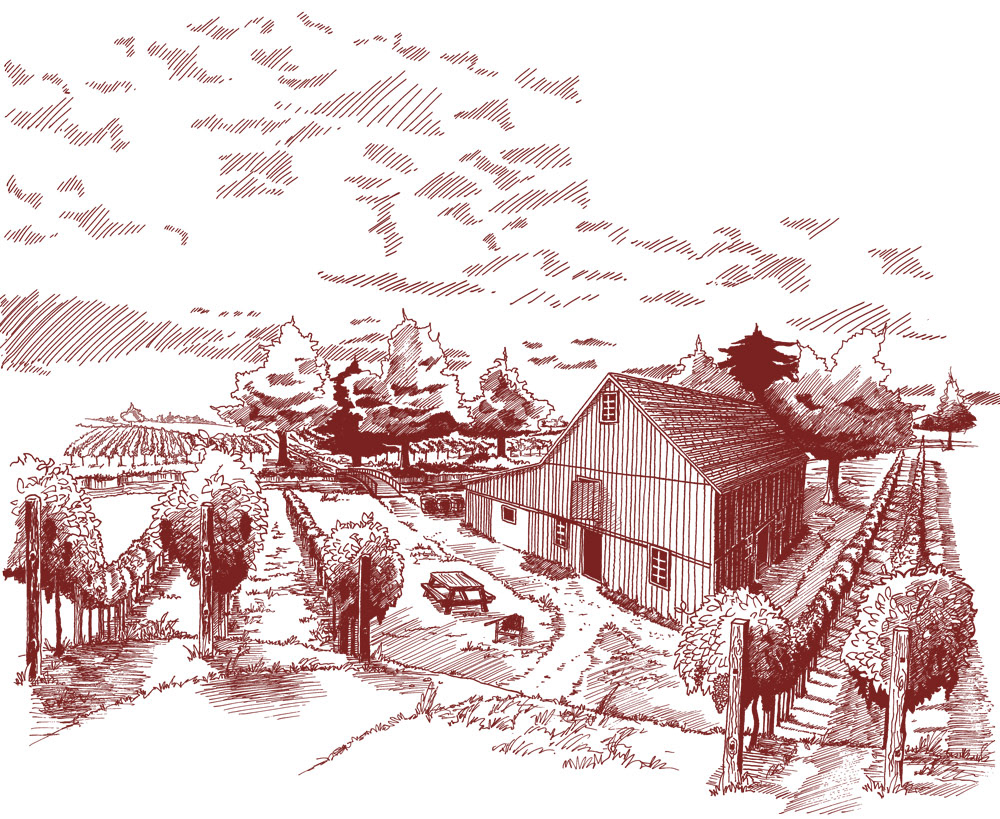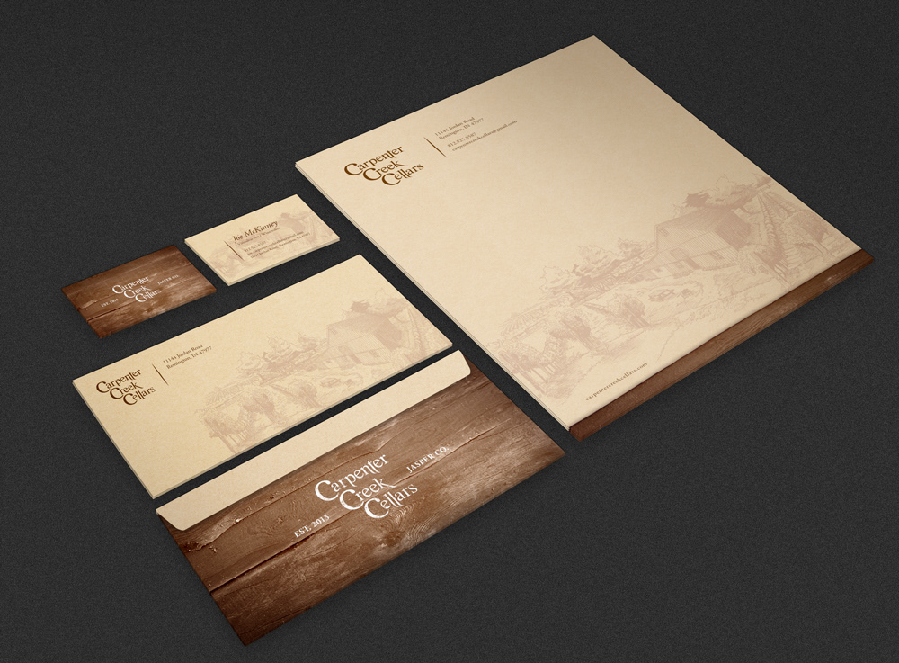 Full-service branding including logo design, stationery, packaging design/illustration, and website design for a small winery in Remington, Indiana.